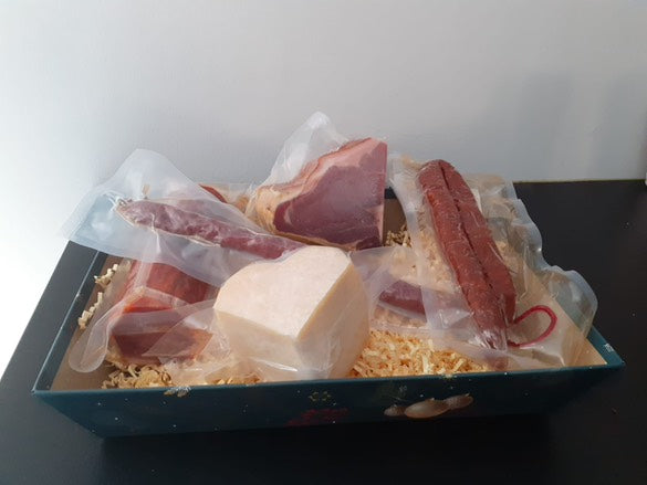 Ce coffret est composé d'un morceau de jambon D.O, un lomo, un fuet, un chorizo piquant ainsi qu'un fromage de brebis mi affiné.